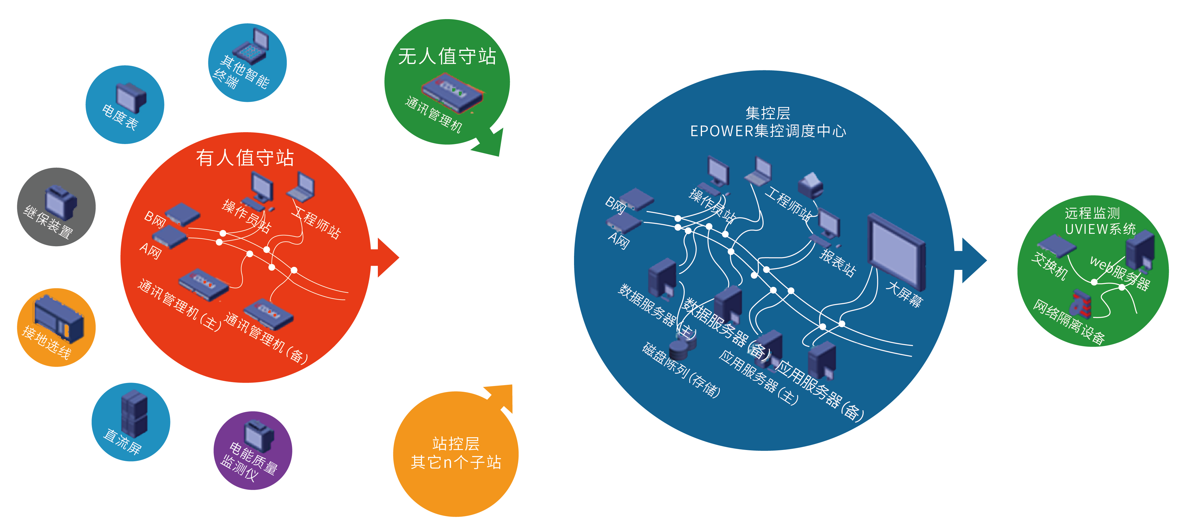 實施變電站集中監控系統,實現變電站無人值守遠程集控,讓多個電力站點可以在線維護,節約人工、物力等資源成本,打造新時代、高效、節能、智能的電力運維模式,讓變電站巡檢、維修、管理等工作更高效進行。電力調度(集控)自動化系統匯集各個子站信息的數據采集和監控,主要功能包括:數據采集、信息處理、統計計算、遙控、報警處理、安全管理、實時數據庫管理、歷史庫管理、歷史趨勢、報表產生與打印、畫面組態與顯示、多媒體聲音報警、事件順序記錄、高級應用軟件PAS等。